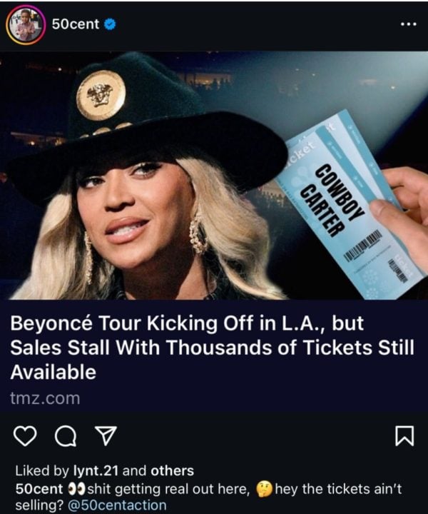 50 Cent don’t miss … anything, does he? The G-Unit boss took to social media with a candid reaction after reports surfaced about slow ticket sales for Beyoncé’s much-anticipated Cowboy Carter tour. According to TMZ, approximately 3,800 seats remained unsold for the opening night at Los Angeles’ SoFi Stadium on Monday, April 28, with prices ranging from $47 to $331.