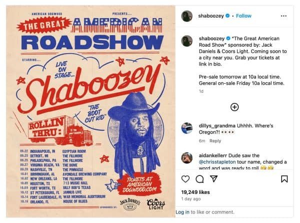 Shaboozey’s tour supports his 2024 album Where I’ve Been, Isn’t Where I’m Going, which features the Billboard Hot 100 smash hit “A Bar Song (Tipsy),” a chart-topping track that cleverly incorporates a sample from J-Kwon’s “Tipsy.” Earlier in April, he released a deluxe edition of the album with new collaborations featuring Jelly Roll, Myles Smith, and Sierra Ferrell. The updated project is led by the new single “Good News.”