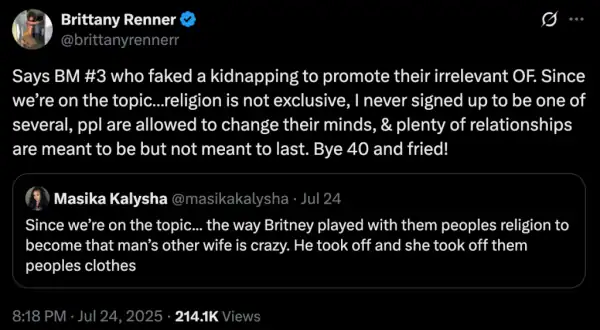 Masika’s comments surfaced while she was commenting on a recent altercation from Basketball Wives LA involving Jackie and Chantel Christie. Shifting gears, she took a jab at Renner in a follow-up post, writing, “Since we’re on the topic… the way Britney played with them peoples religion to become that man’s other wife is crazy. He took off and she took off them peoples clothes.”