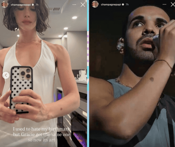 Drake surprised fans with a rare moment of self-reflection on the Gram, crediting rising singer Gracie Abrams with helping him see beauty in something he used to dislike. On August 4, the rap superstar posted two photos side by side. One showed Abrams. The other featured Drake performing shirtless, his arm and a distinct brown birthmark fully visible. The caption read, “I used to hate my birthmark but Gracie got the same one. Now it’s art.”
