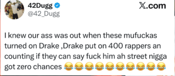 In a follow up, he doubled down with an even sharper point. “I knew our ass was out when these mufckas turned on Drake, Drake put on 400 rappers an counting if they can say fck him ah street n***a got zero chances.”