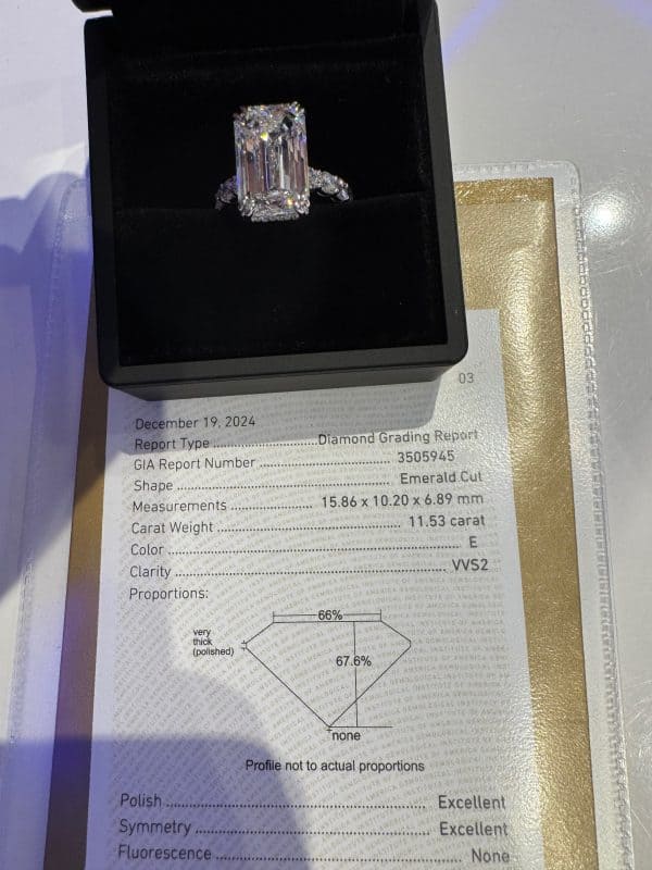 The post featured a look at the couple’s extraordinary engagement ring, custom-designed by celebrity jeweler Eric The Jeweler of Mavani & Co. The masterpiece features an emerald-cut 11.53 carat diamond, graded E color and VVS2 clarity, with an estimated value of $1.1 million. The elegant and rare design is a perfect symbol of the couple’s unique love story.