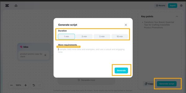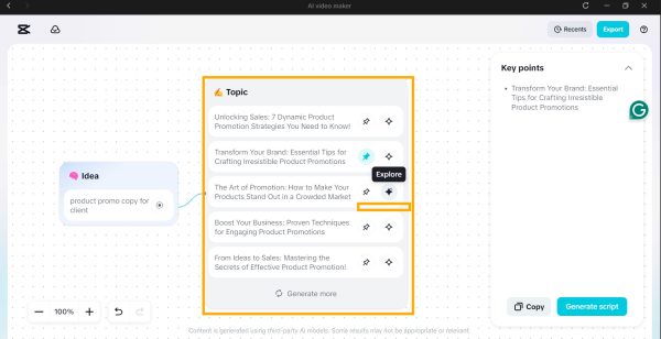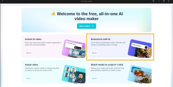 CapCut Desktop PC should be installed and the AI Video Maker tool opened. To begin generating product promo ideas, click on Brainstorm with AI. Have information about your product, target audience or campaign goal in the input field. The AI will give a number of copied ideas that are specific to you.