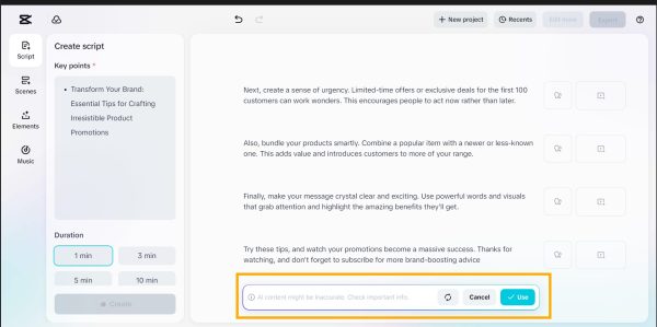 Determine the length depending on the platform, short on social media or longer on email. Click Use to complete the script, or Click Create again to get a new one.