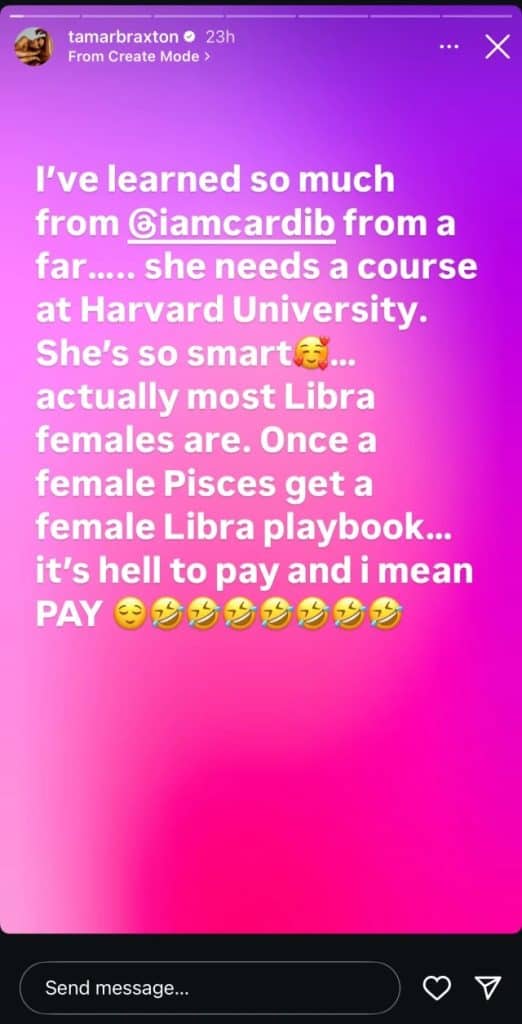 “She needs a course at Harvard University,” Braxton wrote about Cardi. “She’s so smart actually most female Libra females are. Once a female Pisces get a female Libra playbook … it’s hell to pay and I mean PAY.”