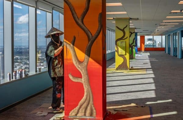 One example of Super Buddha’s work in the office is a series of columns stretching along a wall of windows, each with a uniquely colored tree trunk. Each column bears the marks of deliberate, incremental work. Brushstrokes vary in density. Edges waver slightly. The motif of a tree trunk repeats, but no two renderings are identical. The cumulative effect is a pattern of individuality within structure.