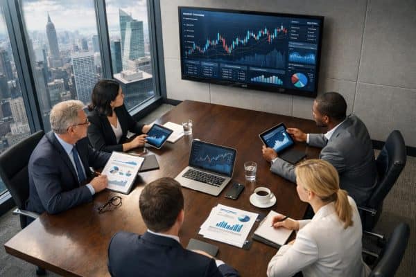 Alt text: Bird’s-eye view of executives in a modern boardroom analyzing financial charts on tablets and a large screen.