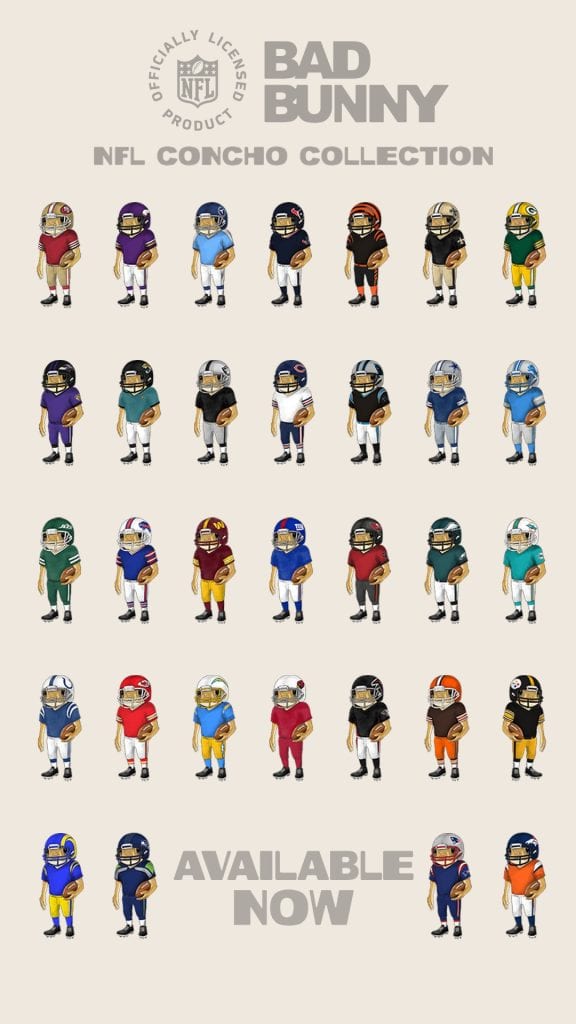 The first drop, titled The Fans or Concho Collection, is out now. Inspired by the Puerto Rican toad Bad Bunny frequently embraces, the capsule includes apparel and New Era hats for all 32 NFL teams, along with a collectible Concho plushie keychain.