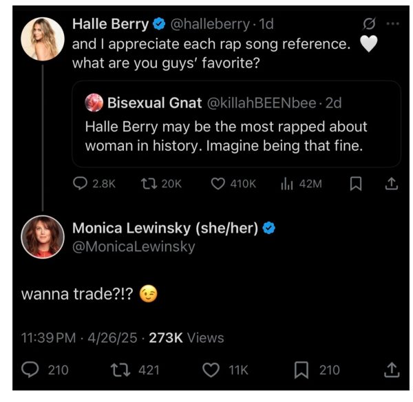 Here’s a chat we did not have on our Hip Hop meets pop culture meets Hollywood bingo card. Monica Lewinsky and Halle Berry recently shared a playful social media moment, sparked by their shared presence in the world of hip-hop lyrics—though for very different reasons.
