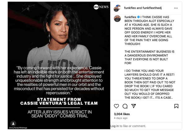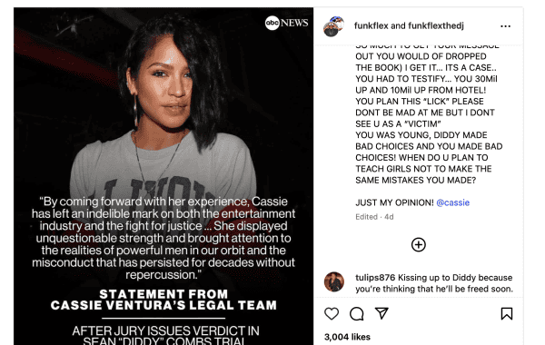 After the verdict was delivered clearing Diddy of racketeering conspiracy and sex trafficking charges, public reaction erupted across social media. Among the loudest voices was Funkmaster Flex, who took to the Gram to post a photo of a statement from Cassie’s legal team that praised her strength and resilience. Flex began his message by appearing supportive, writing, “THE ENTERTAINMENT BUSINESS IS A DANGEROUS ENVIRONMENT THAT EVERYONE IS NOT BUILT FOR!” He acknowledged what Cassie endured at a young age and wished her peace while processing the pain.